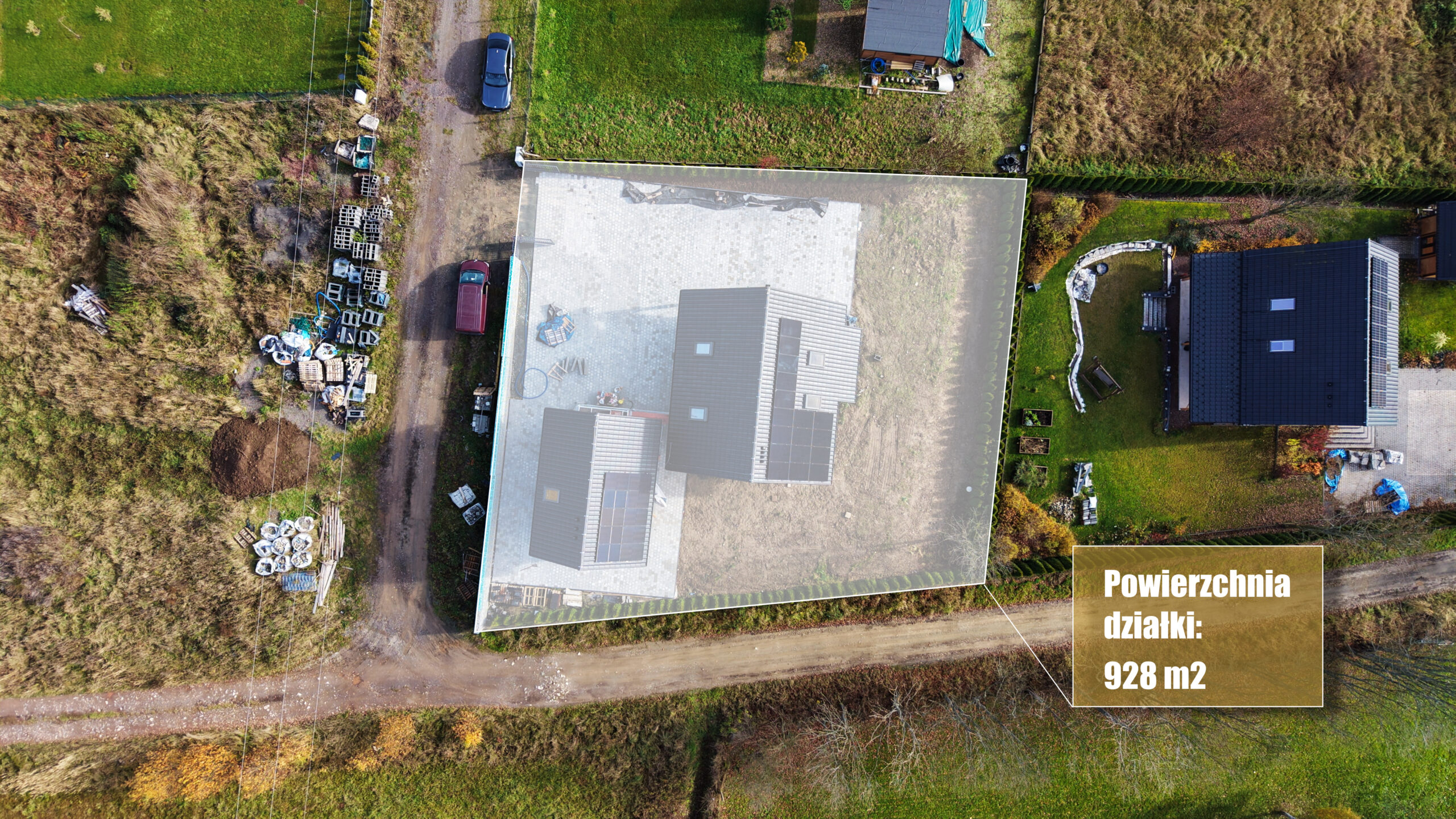 - działkę o powierzchni 928 m², w pełni ogrodzoną i wyłożoną kostką, z bramą wjazdową,